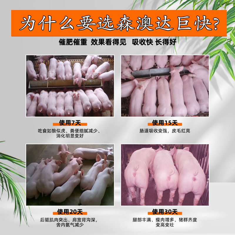 2、提高飼料利用率:清洗腸胃粘膜,胃腸壁厚度變薄,改善腸道免疫屏障,充分消化飼料中的營養(yǎng)物質(zhì),提高飼料消化吸收率,糞便細(xì)膩,飼料殘渣幾乎消失,糞便體積量明顯減小。同時本品可促進(jìn)飼料中碳水化合物的分解,非蛋白氨合成轉(zhuǎn)化為高品質(zhì)蛋白質(zhì),飼料利用率提高20%左右,家畜可提前出欄15-30天。3、改善體型,拉大骨架:明顯改變家畜的體型,肌肉突起,背溝加深,使家畜臀腿肌發(fā)達(dá)飽滿,體形豐滿結(jié)實,改善酮體品質(zhì),提高屠幸瘦肉率896-15%。