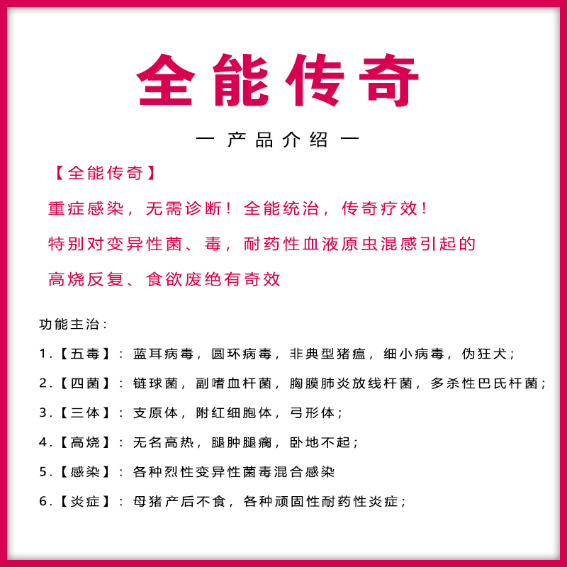 1、用于藍(lán)耳病、圓環(huán)病毒病、非典型豬瘟、口蹄潰爛、偽狂犬、細(xì)小病毒病的預(yù)防與治療。對抗生素難以控制的病毒性、細(xì)菌性